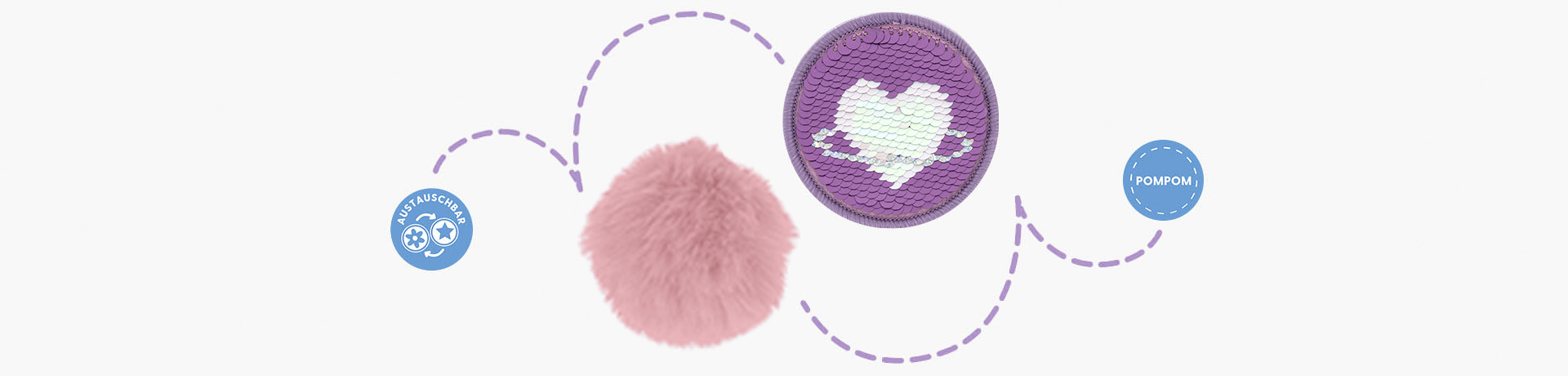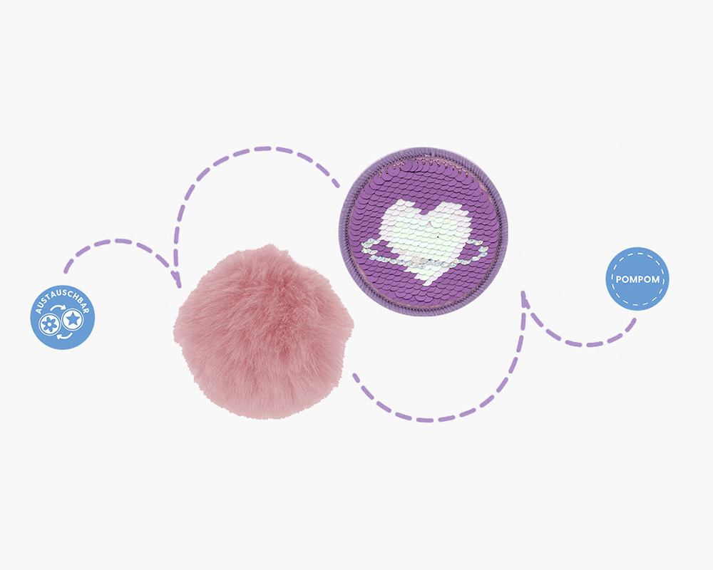 Jedes Design beinhaltet ein leeres Schüleretui mit 2 Klappen, einen ovalen Faulenzer sowie einen Sportbeutel im passenden Look. Dazu gibt es zwei austauschbare Applikationen.