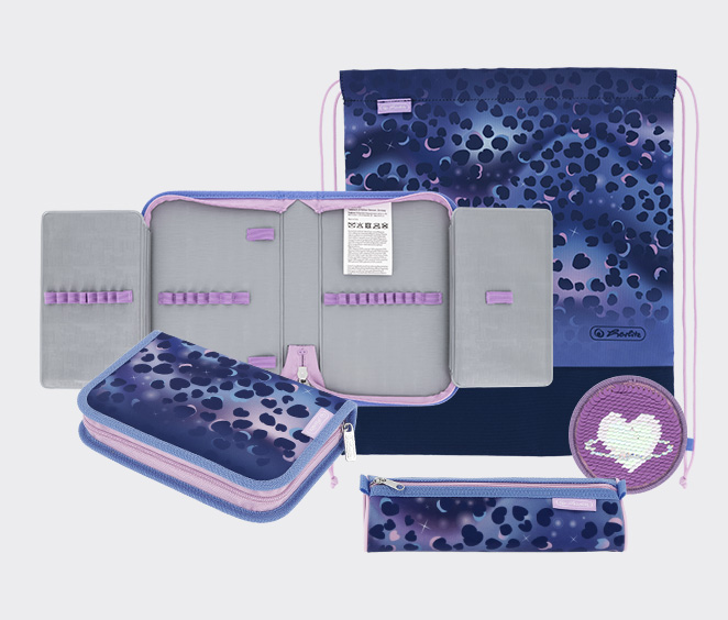 Jedes Design beinhaltet ein leeres Schüleretui mit 2 Klappen, einen ovalen Faulenzer sowie einen Sportbeutel im passenden Look. Dazu gibt es zwei austauschbare Applikationen.