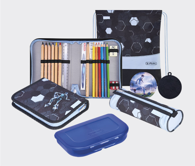 includes a filled pencil case with 16 pieces, a pencil pouch oval, a sports sac, a lunch box and one velcro-application, as well as a felt dangler "turtle".